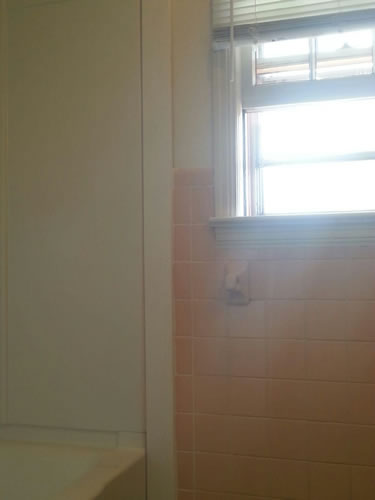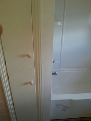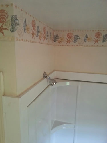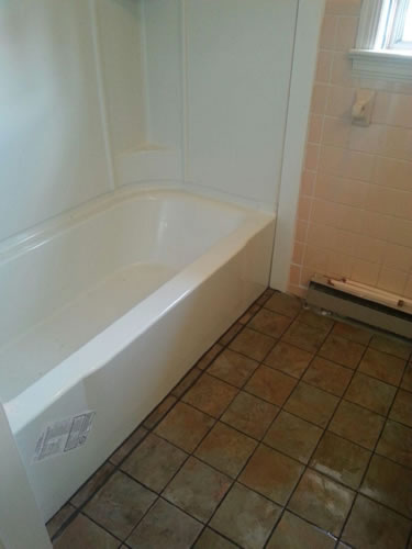 Remodeled bathroom including new floor tile in front of the tub unit. Fixtures furnished by Shank Wholesalers, Inc., Harrisonburg, VA