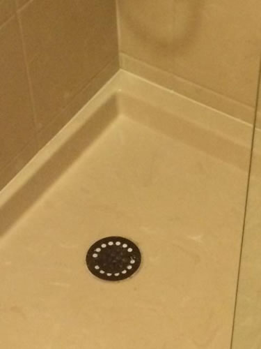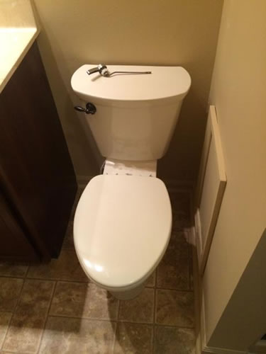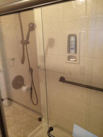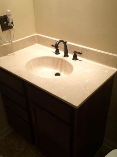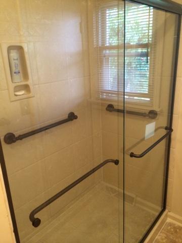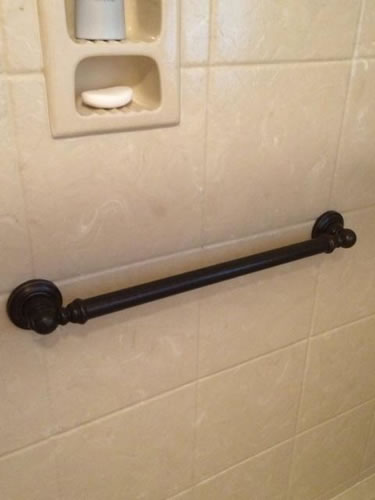 Remodeled bathroom including Shower base with cultured marble walls, grab bars, comfort height commode, cabinet, cluttered marble top and lavatory faucet, and medicine cabinet. Fixtures furnished by Shank Wholesalers, Inc., Harrisonburg, VA.